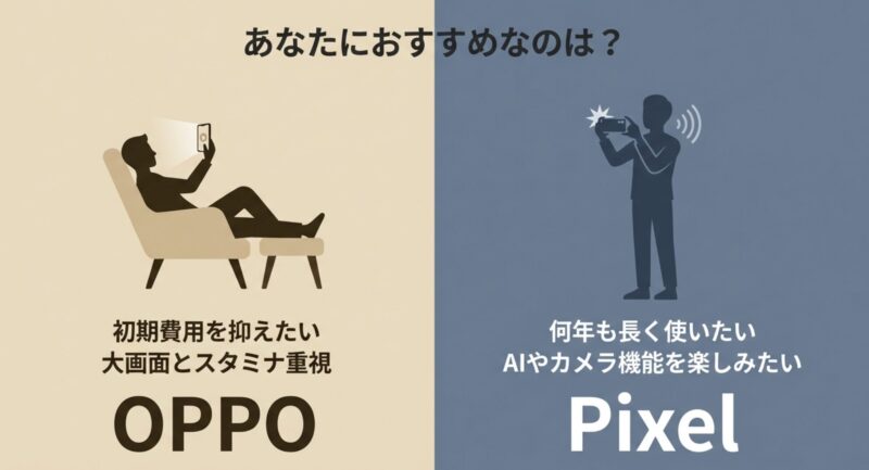 結論として、今すぐ出ていくお金を5万円以下に抑えたいならOPPO Reno13 Aが圧倒的に有利ですし、初期費用はかかっても、1台を極限まで長く大切に使いたいという長期的な投資目線を持つなら、Pixel 8aも十分に元が取れる素晴らしいコストパフォーマンスを秘めていると言えます。
