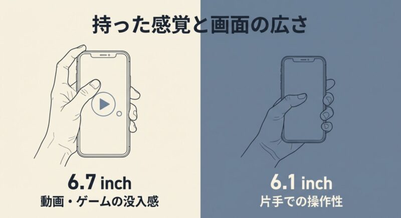1. 6.7インチの没入感を取るか、6.1インチの操作性を取るか