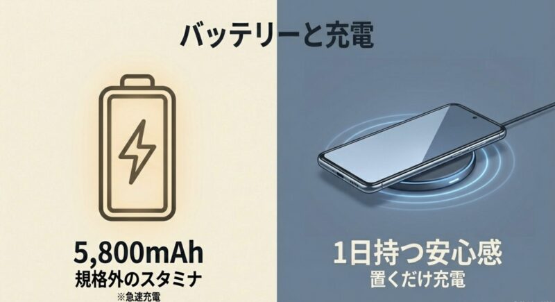 なんと、OPPO Reno13 Aには5,800mAhという規格外の超大容量バッテリーが搭載されているんです。