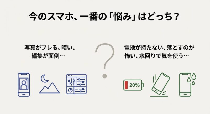 あなたが一番イヤなのは「電池切れ」なのか「写真の失敗」なのか、そこが見えると決めやすいですよ。