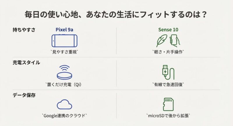 言い換えると、Pixel9aは“体験が伸びる”スマホ、sense10は“安心が積み上がる”スマホ、みたいな感じです。