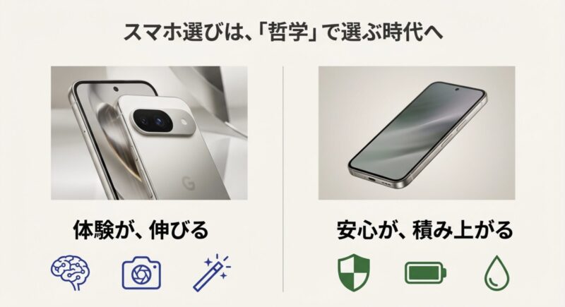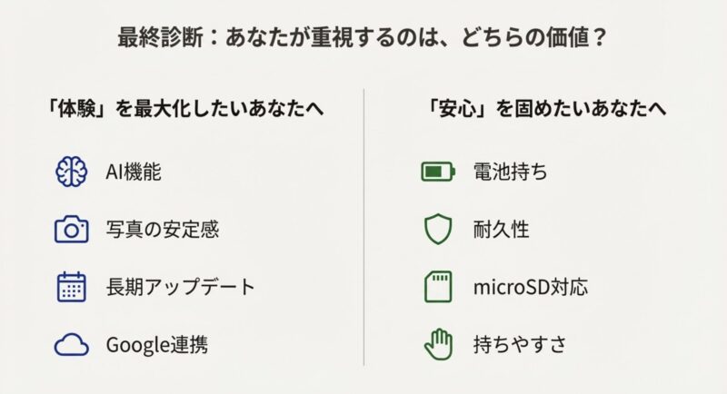 | 方向性 | AI・カメラ・長期サポート | 耐久・電池・実用性 | あなたの生活シーンで決める |