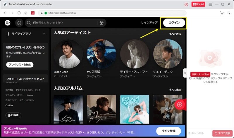 ステップ1、「TuneFab Spotify音楽変換」をインストールして起動した後、「Spotify」サービスを選んで、右上の「ログイン」をクリックして、メールアドレス及びメールで受信したパスコードを入力してログインします。
